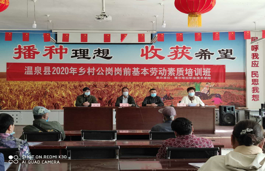近日,由博尔塔拉职业技术学院继续教育和培训部承接的温泉县2020年乡村公益性岗位岗前基本劳动素质培训班正式开班,来自塔秀乡和哈日布呼镇的125名贫困户学员将接受为期7天的培训。
